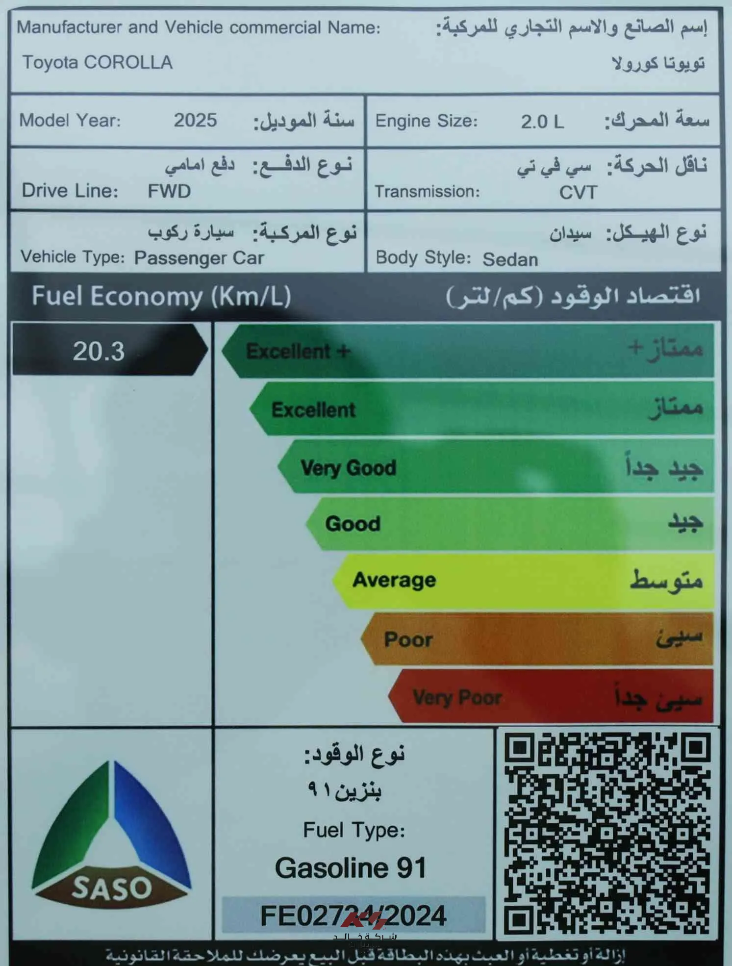 تويوتا كورولا XLI 2.0 (ستاندر طيس) 2025